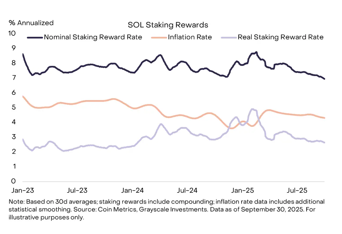 目前,SOL 代幣的供應量每年以約 4% 至 4.5% 的速度增長,在其他條件不變的情況下,這可以被視為代幣持有者價值稀釋的原因。根據網路狀況,SOL 質押者可以獲得約 7% 的名義回報率,但經通膨調整後的獲得的「實際」回報率約為 2.5% 至 3%。目前,約有三分之二的未償還 SOL 代幣已被質押。