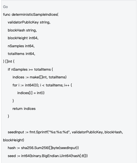 基于种子系统,采样过程完全确定性,确保验证的公平性。通过使用SHA-256哈希函数和验证者的公钥、区块哈希、区块高度等信息生成种子,确保所有验证者使用相同的采样策略: