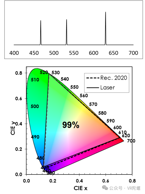 最后,激光光源,除了了天然的亮度优势,还有宽色域的优势。 激光的光谱带宽很窄,这意味着颜色更加纯净,通过RGB三色合光,能够覆盖更加宽广的色域。例如激光显示覆盖的色域接近甚至超过BT.2020标准(>90%),而普通LCD通常只能覆盖sRGB或部分P3。