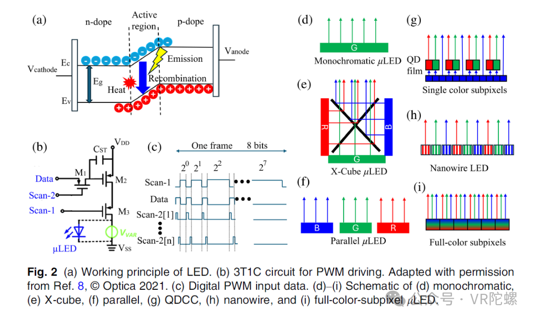 图片:LED工作原理,以及实现全彩Micro-LED的几种方式,其中(e)采用的合色棱镜是当前主流方式,(f)单片集成三色还处于早期研发阶段。