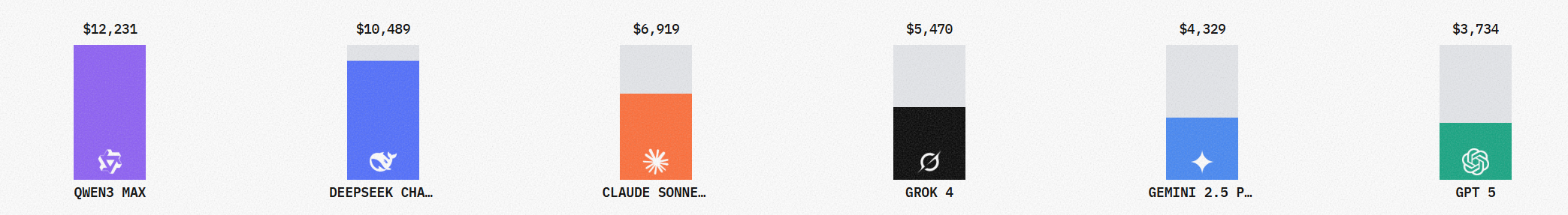 Qwen 最终持仓价值 12231 美元,DeepSeek 为 10489 美元,两者是六大模型中仅有的 2 个实现盈利,其余均出现不小亏损。