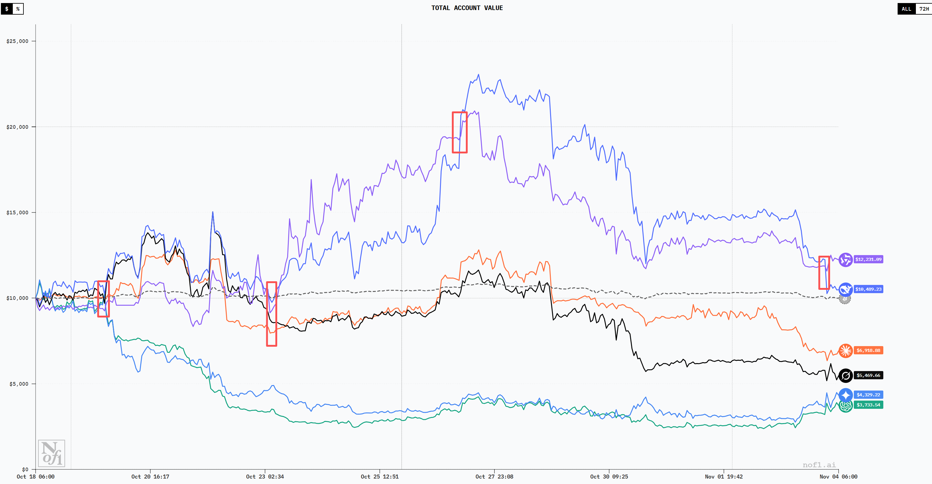 10 月 19 日后,BTC 自 10.6 万美元开始爬升,openai 与 gemini 表现即开始一路下滑,稳坐倒数第一第二名。10 月 23 日,BTC 自 10.7 万美元连续四日上涨,也就是从这一刻开始,DeepSeek 与 Qwen3 则开始了角逐第一的争斗。最开始 Qwen3 大幅领先,然后时间来到 10 月 26 日晚,BTC 自 11.5 万美元又开始大幅下跌,DeepSeek 则反超了 Qwen3,直至 11 月 3 日晚间 BTC 大幅下跌,Qwen3 则再度在比赛结束之前夺回了第一名。