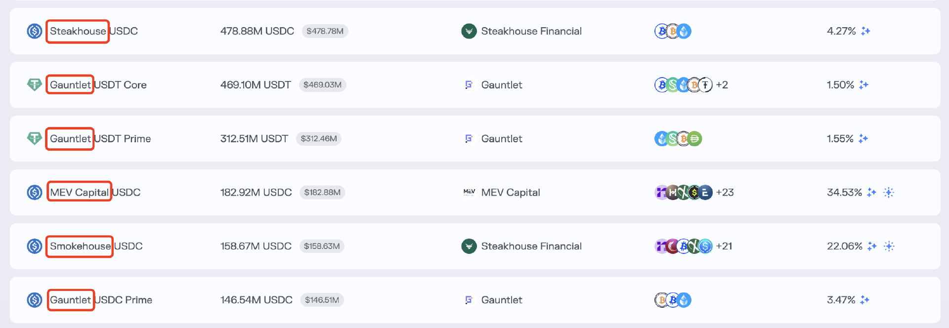 - Odaily 注:上图为 Morpho 上的 Curator 资金池,红框部分的 Steakhouse、Gauntlet 等即 Curator 主体的名称,代表由该主体负责设计、部署、管理该资金池。