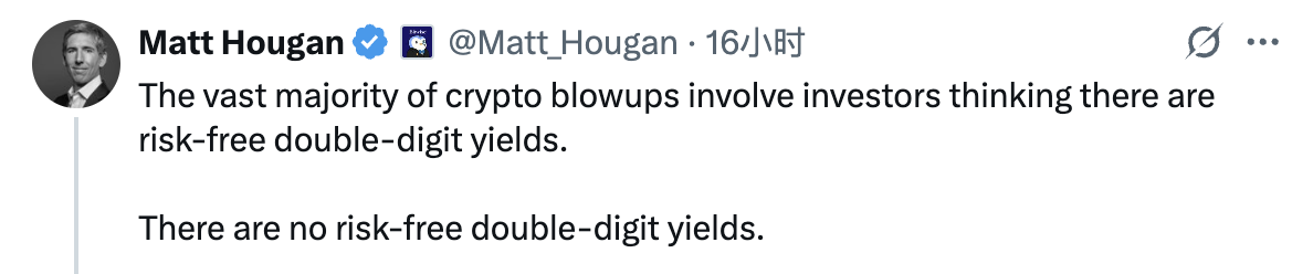 最重要的是,用户需要意识到风险总是与收益率正相关,在投出资金配置决策之前,要对最极端的情况最好思想预防 —— 可以时刻牢记 Bitwise 首席投资官 Matt Hougan 的这句话:“ 绝大多数加密货币的崩盘都是因为投资者误信了两位数的无风险收益率,而市场上根本不存在没有风险的两位数收益率。”
