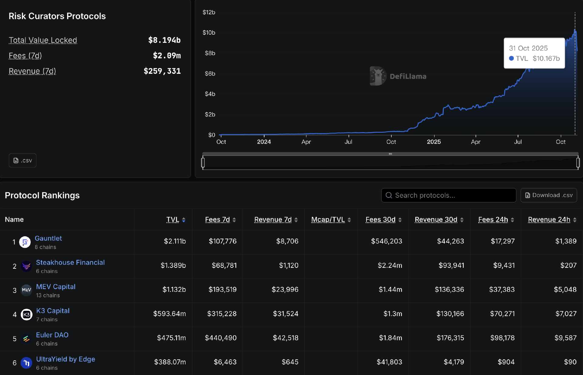 由于 Curator 所负责的资金池往往能够提供比经典借贷市场(如 Aave)更可观的收益,该模式自然而然地可吸引资金的青睐。 Defillama 数据 显示, 由 Curator 负责的资金池总规模在过去一年间飞速增长,10 月 31 日曾一度突破 100 亿美元,截至发文仍暂报 81.9 亿美元。