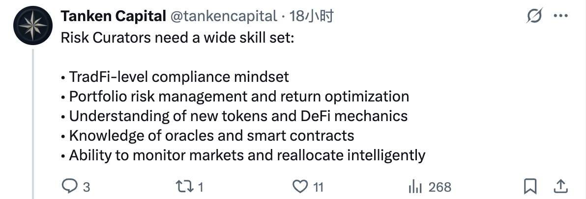 至于 Curator,则需要同时提高风险自律意识以及风险管控能力。 DeFi 投研机构 Tanken Capital 就此总结了一个优秀的 Curator 在风控方面的基本要求,具体包括: