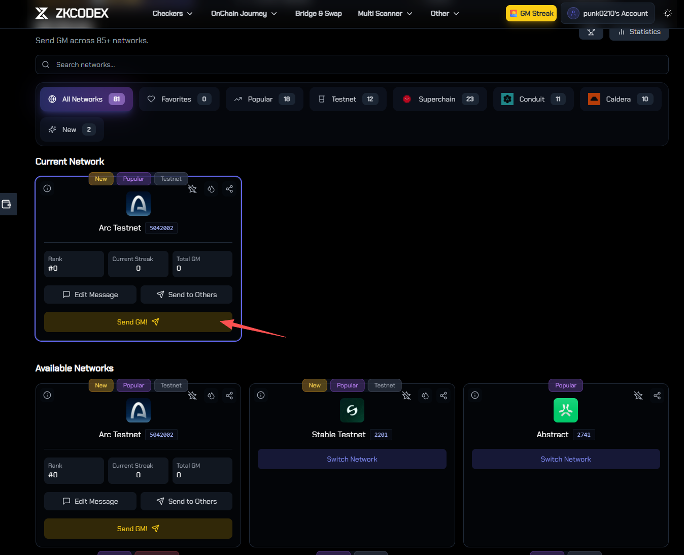 STEP 5. 在 ZKCODEX 平台中选择 Arc 测试网发送 GM(链接: https://zkcodex.com/onchain/gm ),连接钱包后找到 Arc Testnet,点击 Send GM,弹出钱包确认即可。