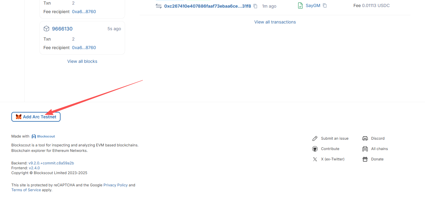 STEP 1. 在钱包中添加 Arc 测试网络( https://testnet.arcscan.app/ ),将页面拉到最下面,在左下角点击 Add Arc Testnet,弹出钱包确认即可。