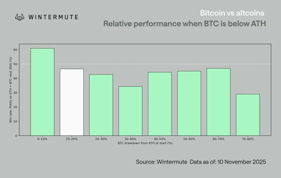 从当前主流币的交易情况来看, 山寨季的开启仍为时尚早 。历史上,山寨币的强势往往出现在主流加密货币接近历史高位时,那种“财富溢出效应”才会被激活。当 BTC 距离历史高点 10–20% 时(目前约 16%),比特币跑赢山寨币的概率约为 54%;而当 BTC 回落至接近 10 万美元区间时,这一概率甚至上升至 58% 。