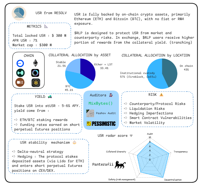USR 完全由链上加密资产支持,主要包括 ETH 与 BTC,不涉及法币或 RWA(真实世界资产)。USR 采用了 Delta 中性的对冲机制,协议会质押用户存入的资产(例如通过 Lido 质押 ETH),同时在中心化交易所CEX)或去中心化交易所DEX)上开设对应的空头永续合约,以对冲市场波动。