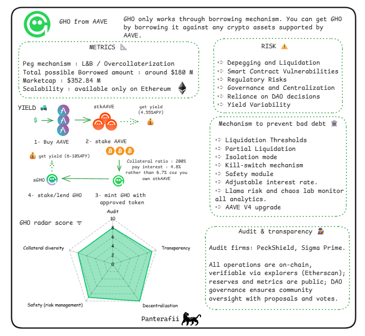 GHO 的风险来源包括:脱锚与清算风险、智能合约漏洞、合规与监管风险、治理与中心化风险、对 DAO 决策的依赖、收益波动性。