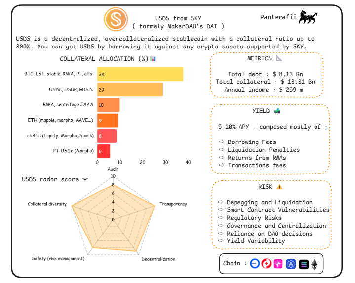 USDS 的风险来源包括:脱锚与清算风险、智能合约漏洞、合规与监管风险、治理与中心化风险、对 DAO 决策的依赖、收益波动性。