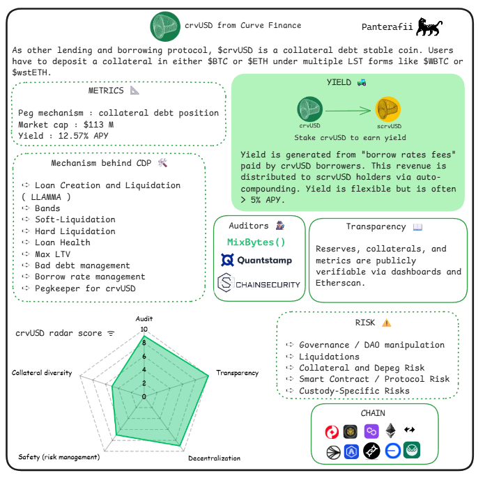 其中最值得关注的点是: crvUSD 的抵押债务头寸模型侧重于借贷功能(150 - 167% 健康率,由 BTC/ETH LST 背书),这使得在市场波动期间,连锁清算成为了其主要风险。