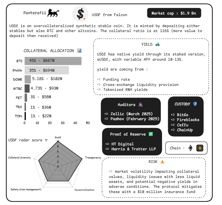 USDF 是一种超额抵押的合成稳定币。它可以通过存入稳定币,也可通过存入 BTC 及其他山寨币来铸造。抵押率设定为 116%(意味着需要存入的价值高于所能借出的价值)。