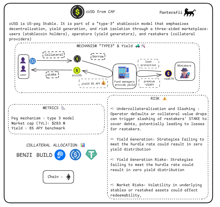 cUSD 是一种与美元锚定的稳定币,该协议模型通过一个三方市场(用户-稳定币持有者、运营商-收益生成者、再质押者-抵押品提供者)强化了去中心化、收益生成和风险隔离。