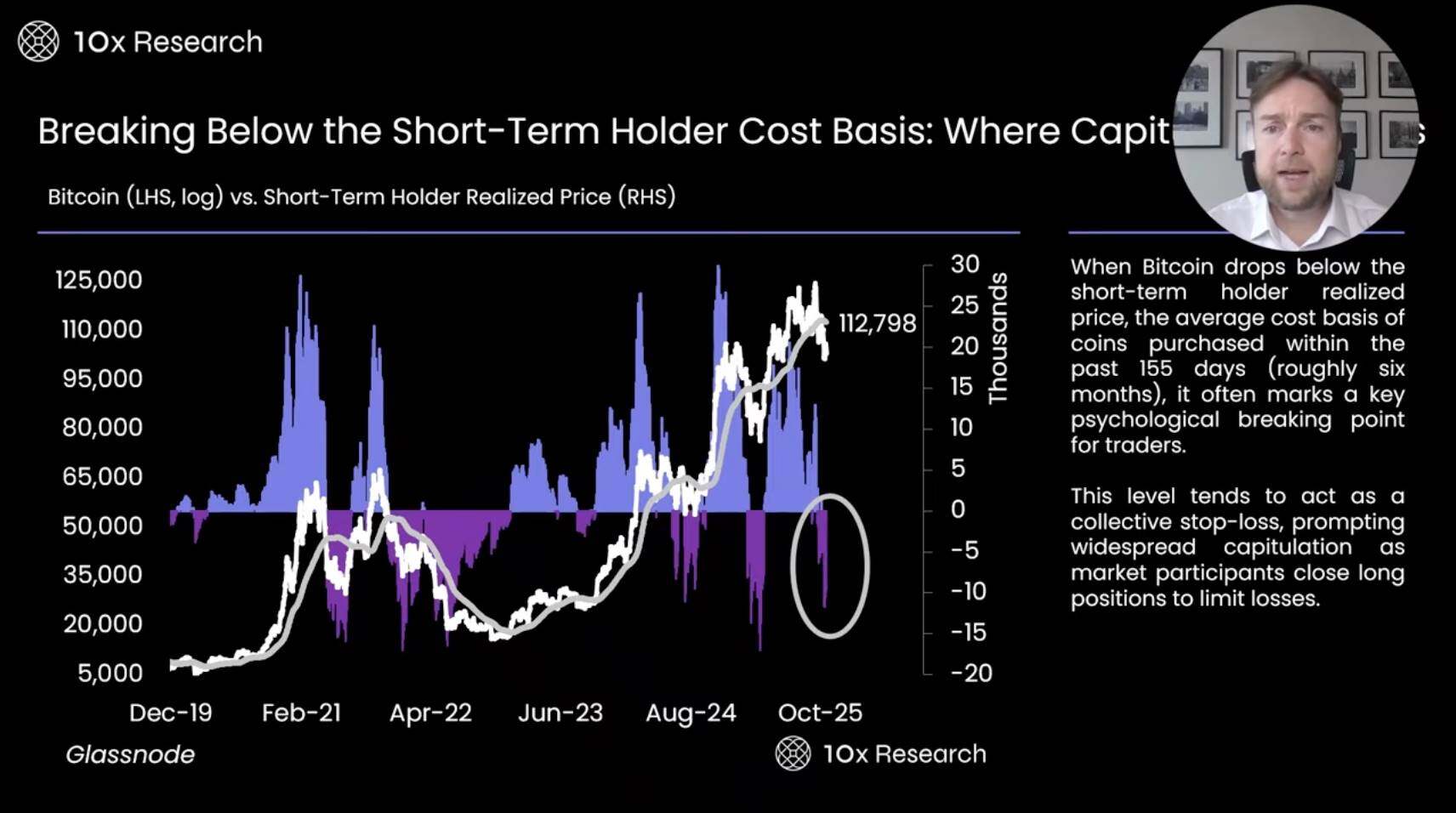 • 短期持有者的实现价格是一个关键指标 ,当前该价格为 112,798 美元(播客录制时),反映过去 155 天内短期持有者的平均买入水平。当比特币价格跌破这一水平时,投资者通常会选择止损,导致市场进一步下跌。这主要是因为短期交易者倾向于在价格上涨的预期下买入,而当价格跌破他们的买入价时,他们会迅速卖出资产。我们可以看到,当比特币跌破 113,000 美元时,价格出现了进一步下跌,同时引发了 10 月份的大规模强制平仓事件。