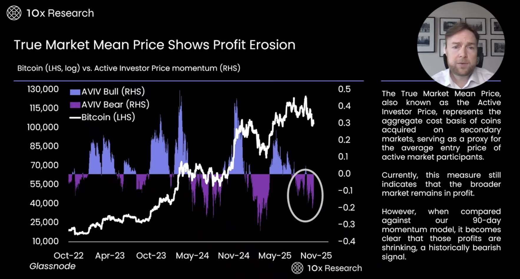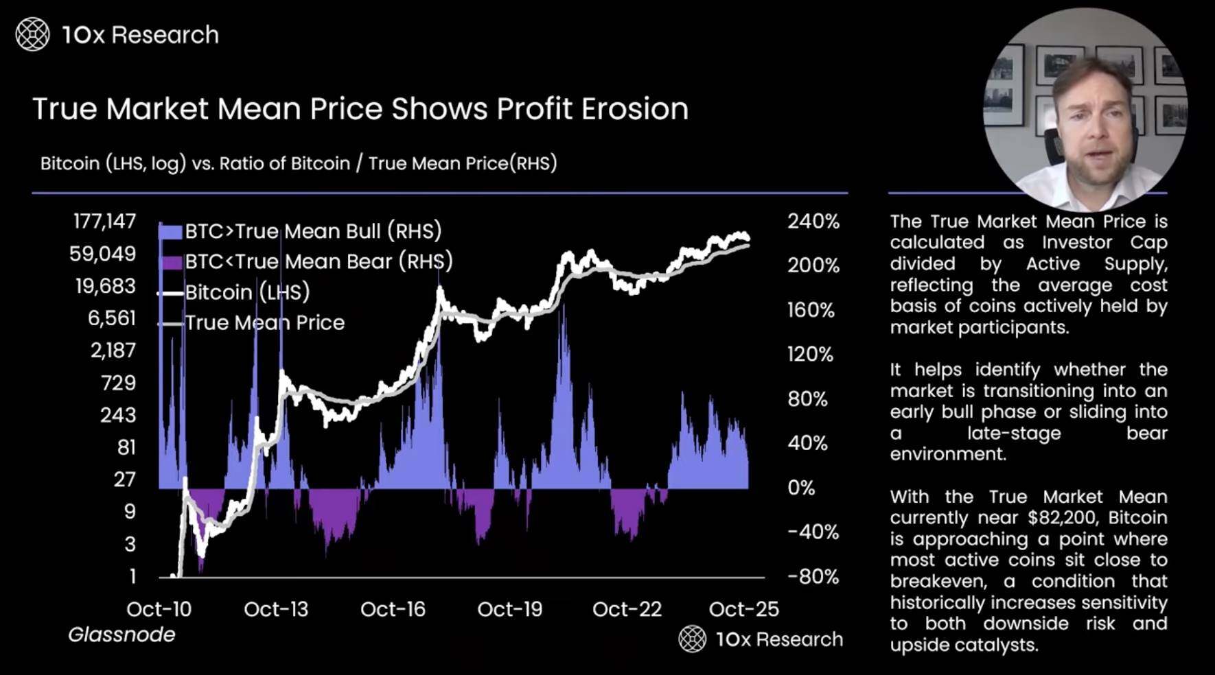 • 链上指标为我们提供了更为谨慎的市场视角。例如,比特币与真实均价 (True Mean Price) 的比率是通过投资者市值 (Investor Cap) 除以活跃供应量计算得出的,用以衡量市场参与者持有币的平均成本。当前数据显示,短期持有者的市场动能正在逐渐减弱,大多数短期投资者正面临亏损。