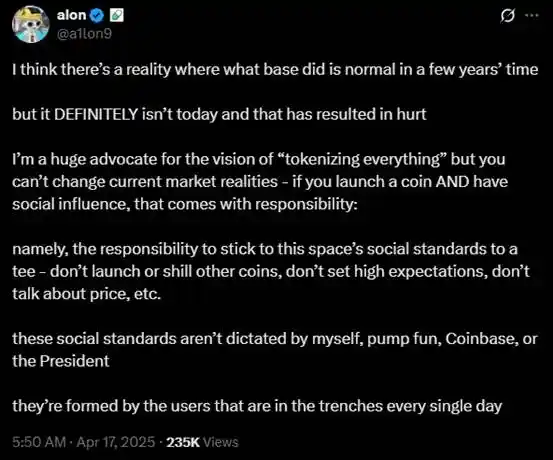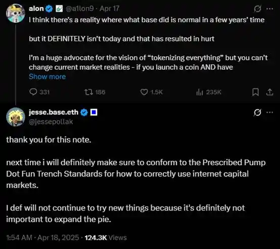 所以,回到這次 Jesse 要發行個人代幣的事件,他所描繪的那些願景對散戶玩家們來說並不能夠輕信。正如他當初回覆 alon 的評論,這些東西是他「做大蛋糕的、對新事物的嘗試」。一方面,他作為 Base 的老大這樣的說法很合乎情理,而另一方面也能看出他對於發行代幣的一種心態,即「既然是嘗試,就有可能失敗」。