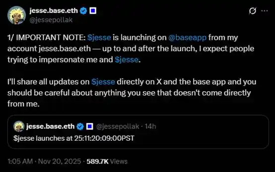 今 日,Base 聯創 Jesse Pollak 表示,即將在 Base App 上推出其個人創作者代幣 jesse,發布時間定於 11 月 20 日太平洋標準時間 9:00(台北時間 11 月 21 日 1:00),jesse 代幣將由其 Base App 帳戶 jesse.base.eth 推出。