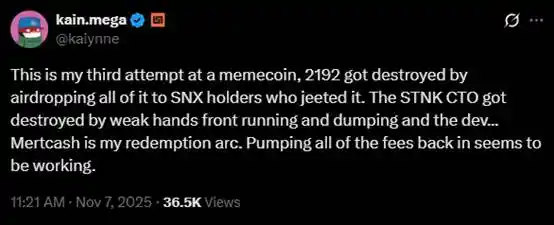 比如前段時間,Solana 上的隱私主題 meme 幣 mec,出自 Helius 執行長 @0xMert_ 在直播中的玩笑,由 Synthetix 和 Infinex 創始人 @kaiynne 部署。當時,@kaiynne 稱,mec 這個他第 3 次推出的 meme 幣是他的「救贖之作」。但他能做的也只是把該代幣產生的創作者收入用於回購,然後,就沒有然後了。
