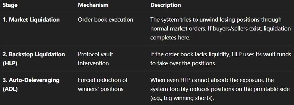 Hyperliquid 把 ADL 形容為洪水中的「分洪區」。當保險基金無法承擔損失時,系統會鎖定槓桿倍數高、已實現收益大的多空倉位,並以破產價格強制減倉或平倉。受影響交易者大多仍保有未實現的部分利潤,但失去繼續放大報酬的機會。官方解釋:
