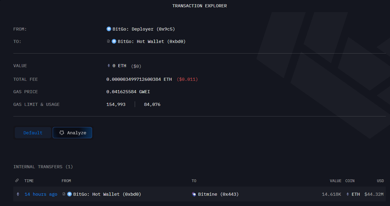 據鏈上數據平台 Arkham 顯示,全球最大的以太坊儲備公司 BitMine,在今(28)日凌晨 6 點左右,再次透過加密貨幣託管服務商 BitGo,買入了約 1.4 萬枚以太坊,買入價值約為 4,400 萬美元。
