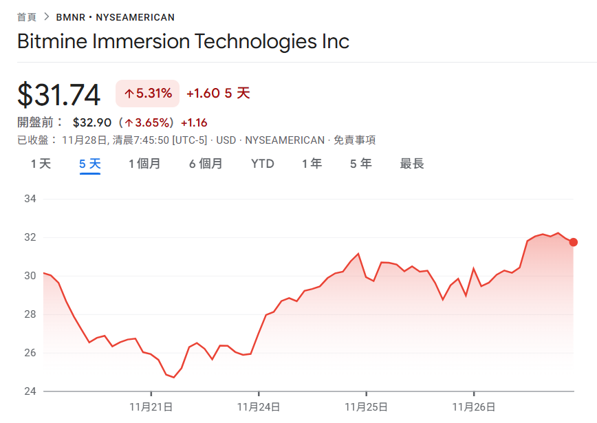 而隨著以太坊回溫,BitMine 的股價也在過去 5 個交易日內迎來反彈、再次站上 30 美元,撰稿當下美股尚未開盤,過去 5 日漲幅為 5.3%,美股盤前上揚 3.65%,市值回升至 131.14 億美元。