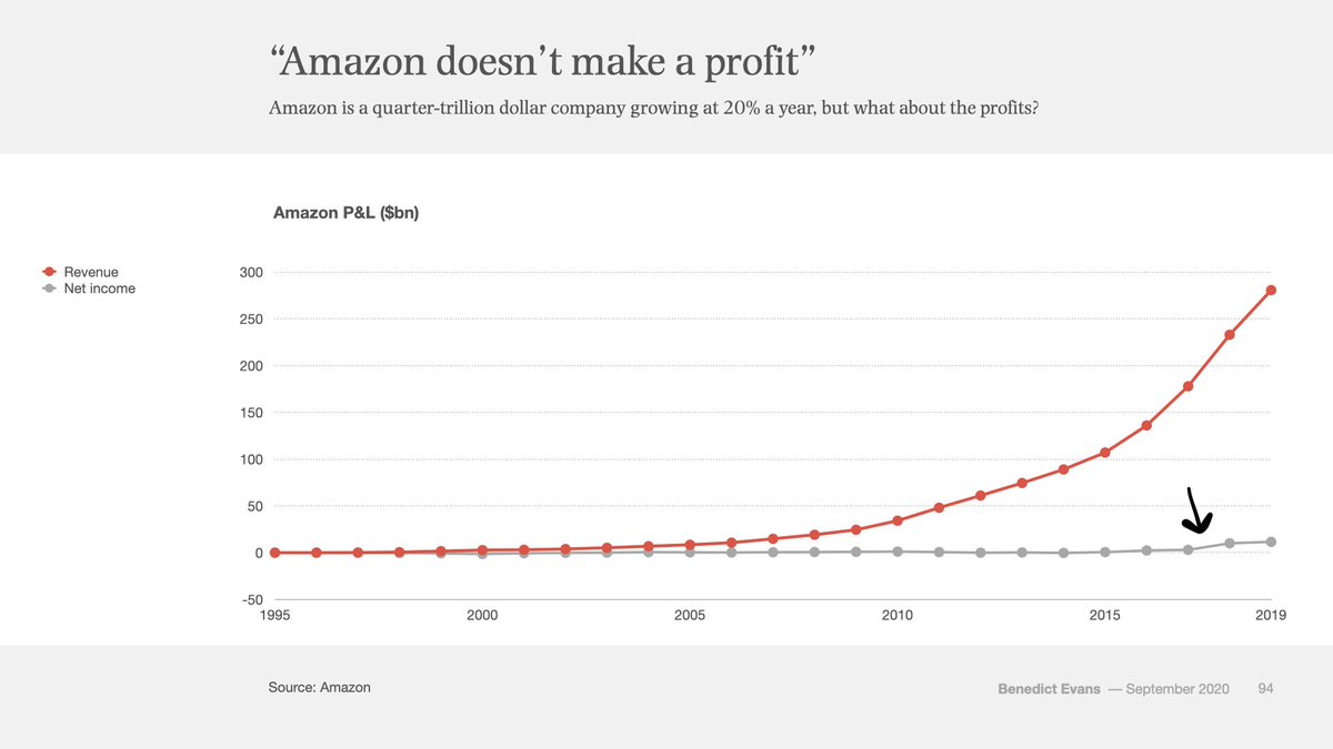 這是亞馬遜從 1995 年到 2019 年的損益表 (P&L),整整 24 年。紅色代表收入,灰色代表利潤。你看到末尾那小小的波動了嗎?灰色線開始向上,那是亞馬遜在成立 22 年後,第一次真正開始盈利的時候。