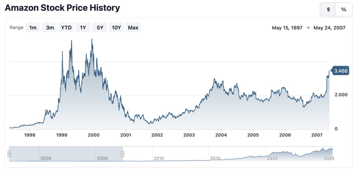 以太坊剛剛滿 10 歲。而這,是亞馬遜前 10 年的股票表現: