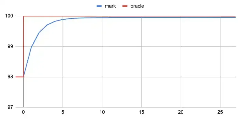 Trade.xyz 的解決方案是把股息計算在資金費率裡。假設預言機價格為 $100,在未來時刻 T 因發放 $2 股息跳變為 $98。在 T 之前的每一小時,標記價格必須呈現出一條平滑的折價曲線。