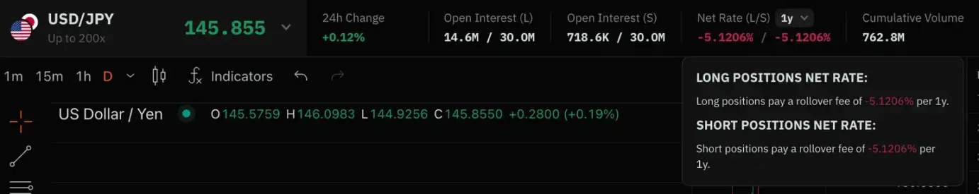 展期費會顯示在淨利率(L/S)標籤上。將滑鼠懸停在上面,會顯示一個說明長短轉期費用的工具提示