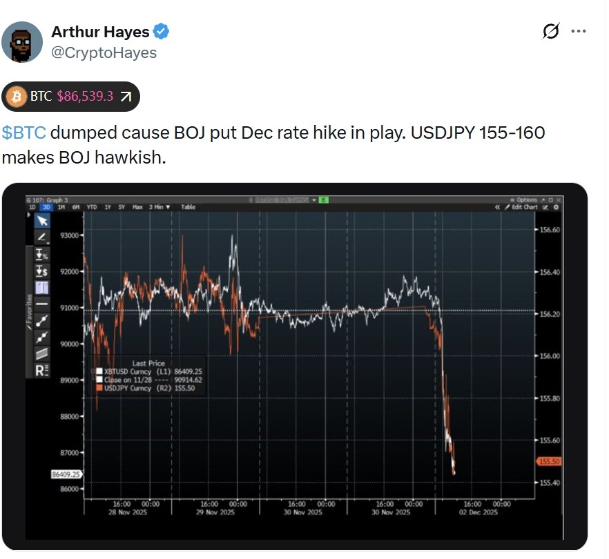 BitMex 创始人 Arthur Hayes 指出,比特币近期下跌与日本央行可能在 12 月加息密切相关。随着美元兑日元汇率升至 155–160 区间,日本央行被迫转向更鹰派的立场,这一变化直接收紧全球流动性,并对比特币构成短期压力。