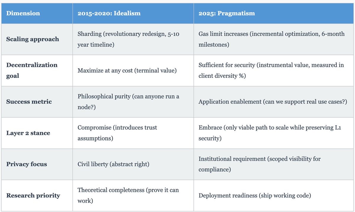 根本性转变:2015 年,以太坊将去中心化、抗审查性和无需信任的特性作为终极价值追求(自身即目标,植根于密码朋克意识形态)。到 2025 年,这些特性转而服务于工具性价值(作为实现实际目标的手段,如消除交易对手风险、实现全球金融普惠、降低运营成本)。这一转变至关重要:理想主义问的是「我们能把这件事做到多去中心化?」,而务实主义问的是「要解决这个问题,我们需要多大程度的去中心化?」2025 年的布宜诺斯艾利斯 Devconnect 大会揭示,以太坊基金会已果断选择了追索后一个问题。