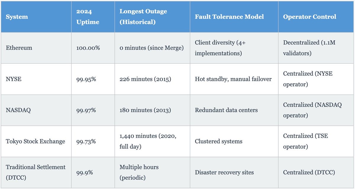 这种架构与传统交易所形成鲜明对比,后者尽管拥有复杂的冗余设计,却仍会经历周期性中断。纽约证券交易所在 2015 年曾中断 226 分钟。东京证券交易所因硬件故障在 2020 年暂停交易一整天。Robinhood 在 2021 年高波动期间经历了多次中断。而以太坊自 2022 年 9 月合并以来,始终保持 100% 的正常运行时间,每日处理超过 100 万笔交易且从未中断。对于考虑采用区块链基础设施的机构而言,这种可靠性记录超越了传统金融市场标准,同时保持了消除单点故障的去中心化特性。