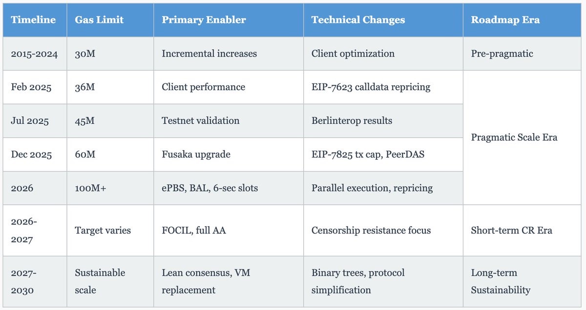 Gas 上限的提升策略将在「务实扩展时代」(2025-2026)推进,通过渐进优化而非架构革命来解决瓶颈。从 3000 万到 6000 万的提升,是通过客户端性能优化和 EIP-7623 调用数据重新定价(该提案对调用数据比例较高的 L2 Rollup 按每字节 40 gas 收费,而标准交易为每字节 16 gas)以及 EIP-7825 交易 Gas 上限限制(每笔交易 1678 万)共同实现的。整个过程分三步进行:3000 万增至 3600 万(2025 年 2 月),3600 万增至 4500 万(2025 年 7 月),4500 万增至 6000 万(2025 年 11 月),并于 12 月 3 日的 Fusaka 升级中正式将默认值定为 6000 万。