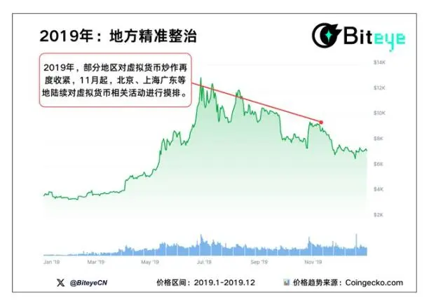 2019 年 11 月起,北京、上海、广东等地陆续对虚拟货币相关活动进行摸排,监管方式转向「地方精准整治」,力度并未放松。当月比特币从月初逾 9000 美元跌至 7700 美元左右,市场情绪一度低迷。
