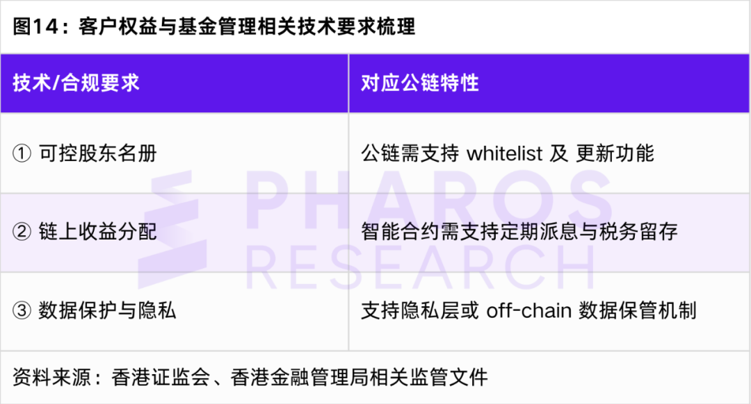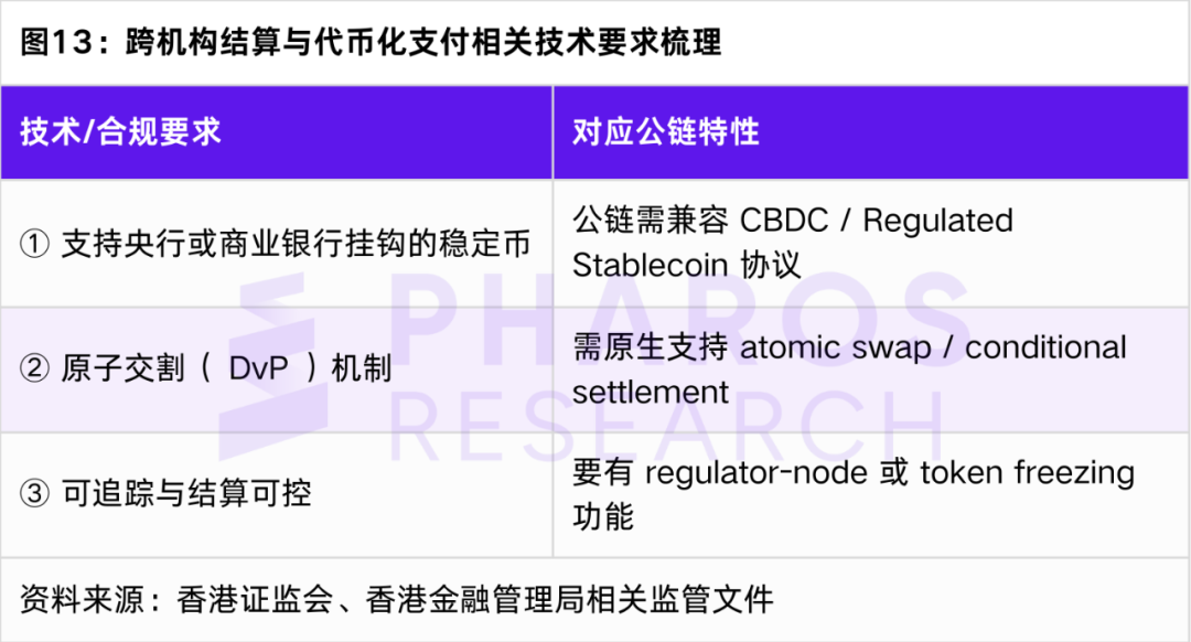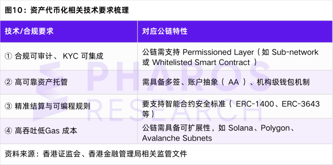 典型公链选择:Solana(高性能)、Ethereum Layer 2(合规生态成熟)、HashKey Chain(自带合规接口)、Pharos(实时+EVM 兼容)。
