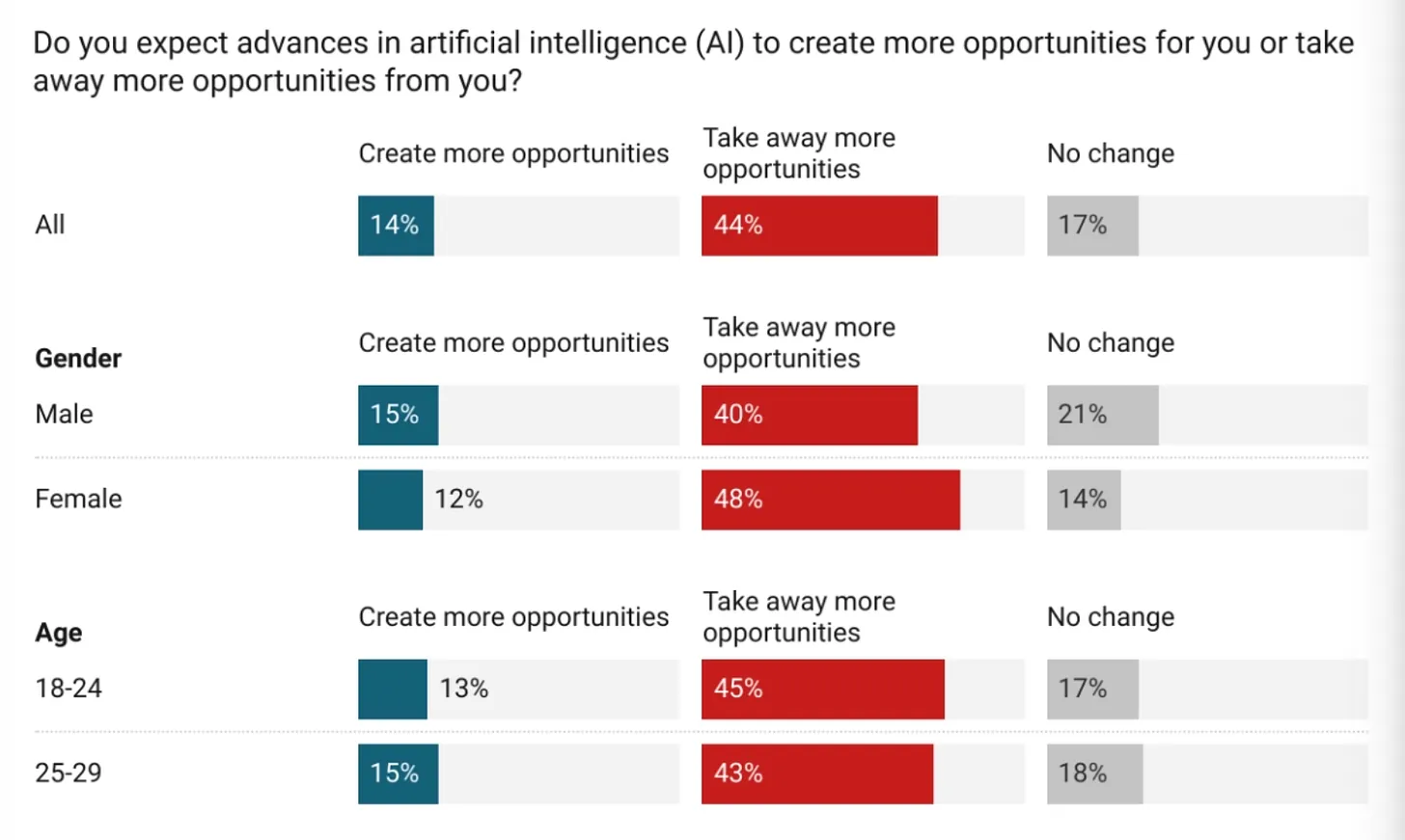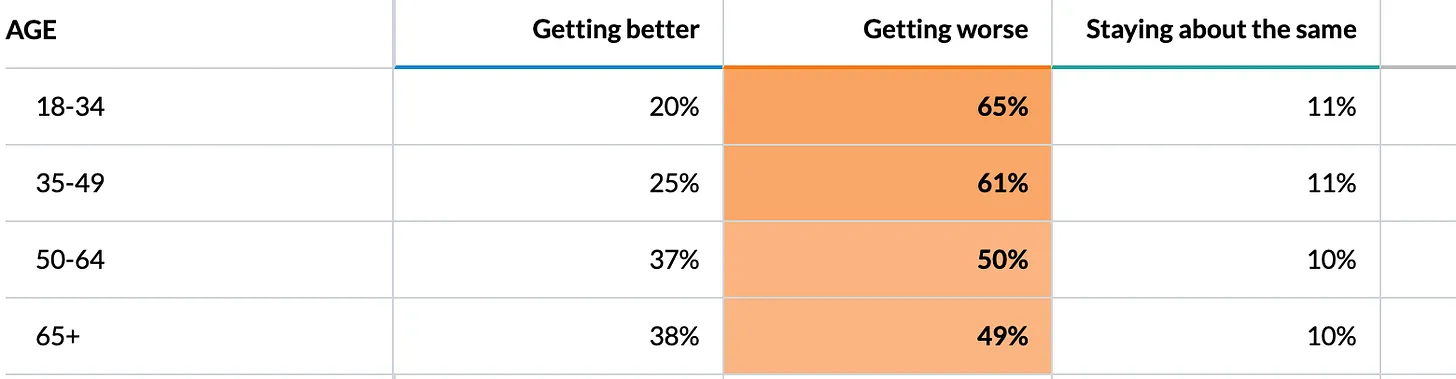 这或许可以部分解释,为什么近 40% 的 50 岁以上美国人认为经济“正在变好”,而大多数 18 至 49 岁的美国人却认为经济“正在变差”。这是两个截然不同的经济世界。年长者在很大程度上免受 AI 和住房冲击的影响,而年轻人则正面临这些威胁的直接冲击。