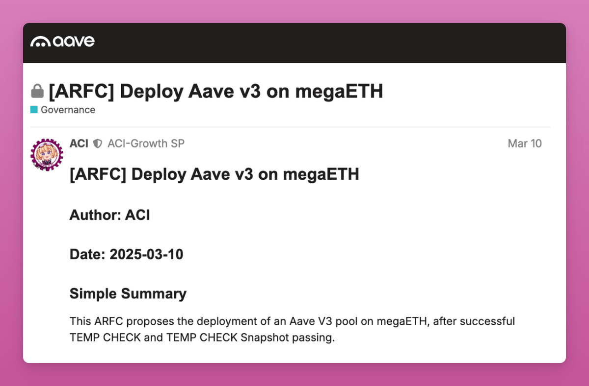 Aave DAO 与多个服务提供商合作,尤其是 ACI,早在 3 月就已提议在 MegaETH 上部署。相关讨论仍在进行中。