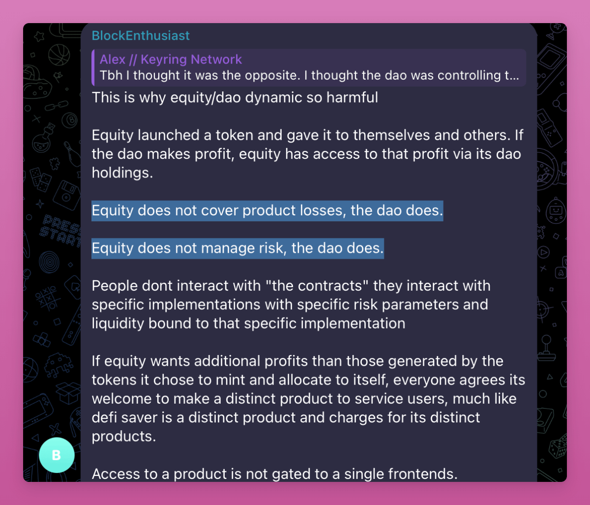 这就是为什么股权 / DAO 动态会造成伤害(这是我从 TG 群聊中发现的)。