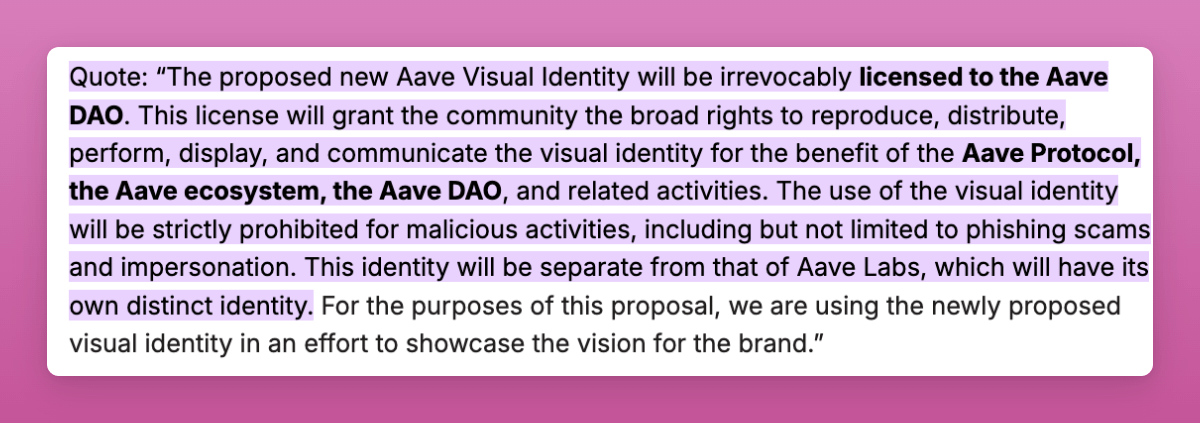 不过,DAO 获得了使用 Aave 品牌和视觉标识的许可权,用于与协议相关的用途。过去治理提案明确授予 DAO 广泛权利,可“为 Aave 协议、Aave 生态系统和 Aave DAO 的利益”使用视觉标识。