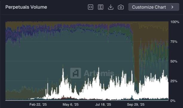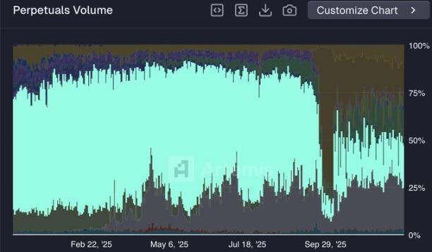 自 2025 年 5 月起,Hyperliquid 市場份額急劇下滑,截至 12 月初,其交易量佔比已從約 80% 跌至接近 20%。