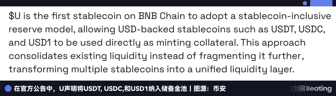 U 的设计逻辑与前两者截然不同:它不直接与 USDT,USDC 或 USD1 竞争,而是将它们都纳入自己的储备金池。某种意义上,U 是「稳定币的稳定币」,或者说「稳定币 ETF」。