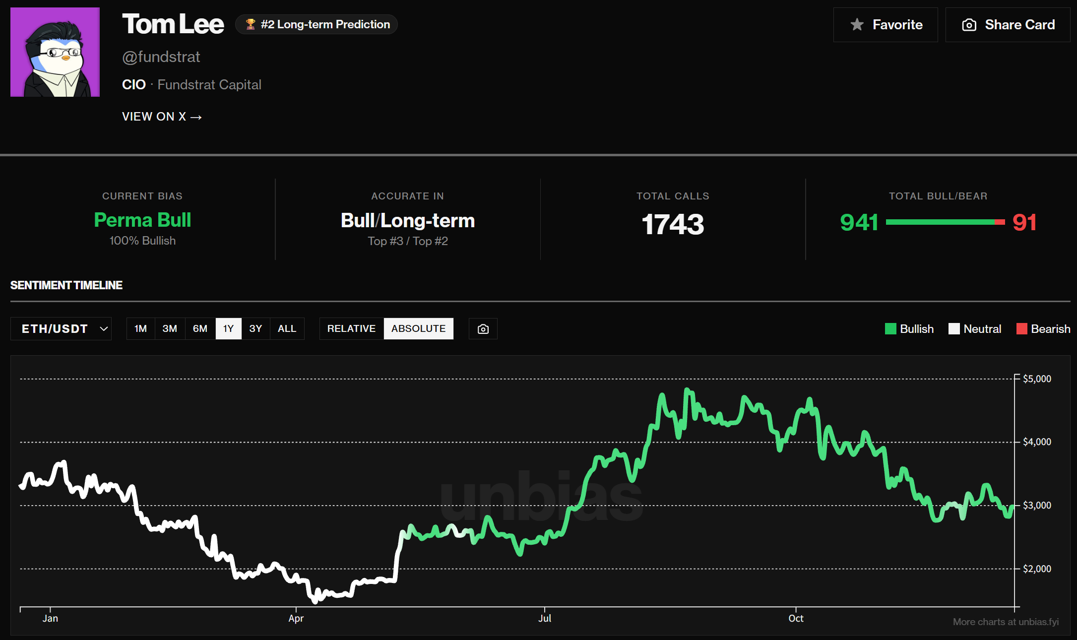 上述預測清單幾乎涵蓋了 2025 年的大部分時間節點,在 unbias fyi 的 Fundstrat 分析頁中,Tom Lee 被標註為「Perma Bull (長期多頭)」每一次發聲都會給予市場更高的目標價和更樂觀的期限展望。然而,這些激進預測與現實走勢相去甚遠。這一系列事實令市場開始質疑,「華爾街神算子」Tom Lee 的可信性。