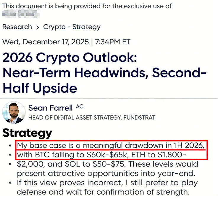 該報告由 Fundstrat 旗下負責加密資產研究的分析師 Sean Farrell 出具,目前擔任數位資產策略主管,主要涵蓋加密市場與區塊鏈相關的策略研究與觀點輸出。該報告主要面向其內部訂閱制的客戶,每月訂閱費為 249 美元。