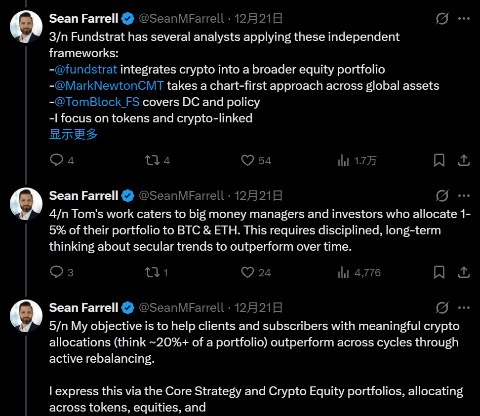 Tom Lee 及其團隊在不同場合矛盾的表態,引發圈內關於其動機和誠信的熱議。針對近期的爭議,Fundstrat 數位資產策略負責人 Sean Farrell 發文回應稱,外界對 Fundstrat 研究流程存在誤解。