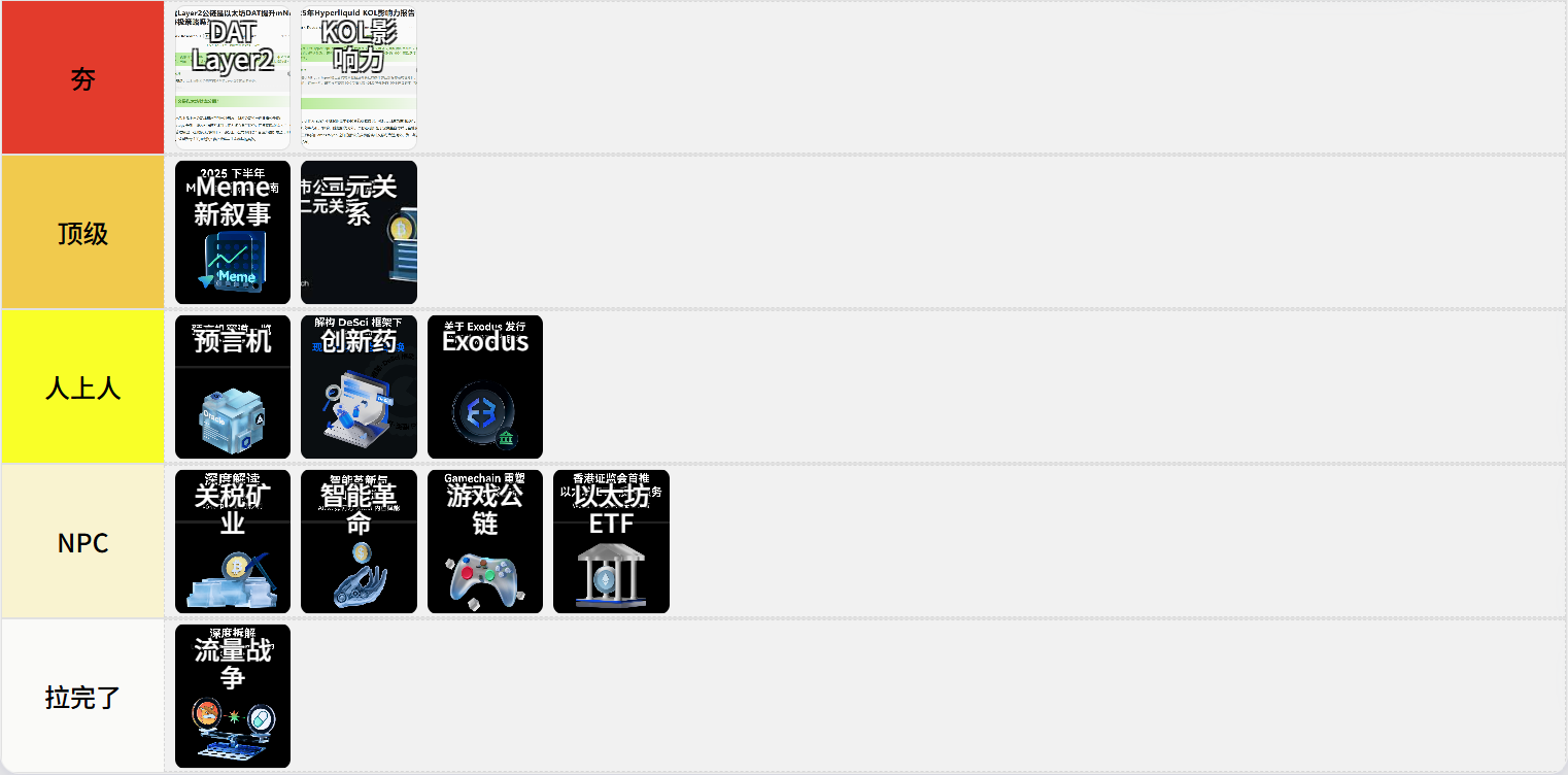 最近网上很流行用从夯到拉去给所有事物排名,似乎万物皆可从夯到拉。作为 Web3 行业的从业者,2025 年的体感只有两个字: “加速” 。经历了 “Trump 发币”、“关税战” “天才法案” “1011” 这些震惊世界的大事,感觉特朗普上台后,整个资本市场和加密世界都被按了加速键,2025 年 1 年发生的事情等于过去 2-3 年发生事情的总和。与此同时,作为内容从业者,我几乎保持了每个月稳定输出一篇深度内容。但在 2025 年即将结束的这几天里,我重读了这些内容,认为有些内容自己写的不错,有些内容却不尽如人意。那在 2025 年的终点,我就套用从夯到拉这个架构,给我自己的文章排排名。