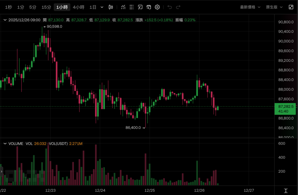 聖 誕假期剛結束,加密貨幣市場仍延續寒意。台北時間 12 月 26 日清晨,比特幣 (BTC) 再次短暫跌破 8.7 萬美元,截稿前拉回 87,282 美元,過去 24 小時下跌 0.42%。