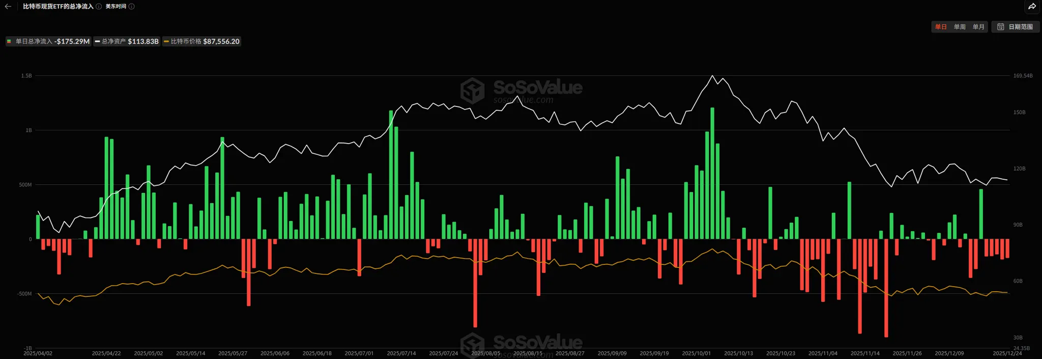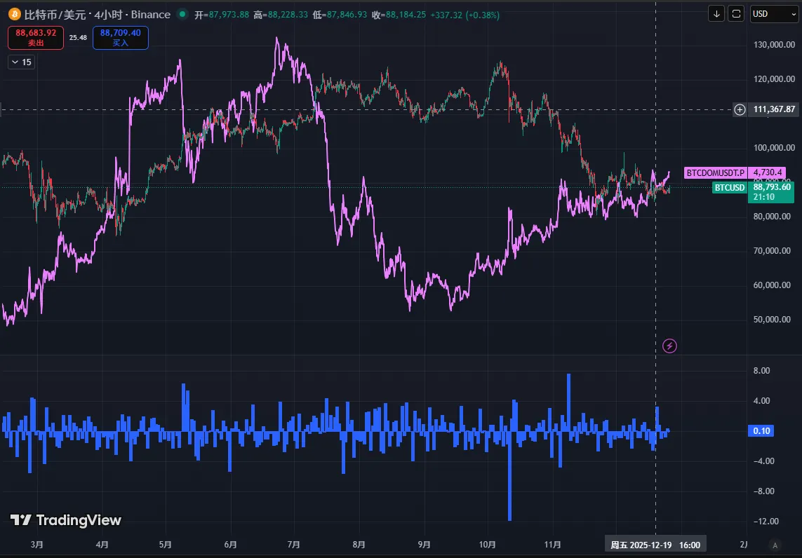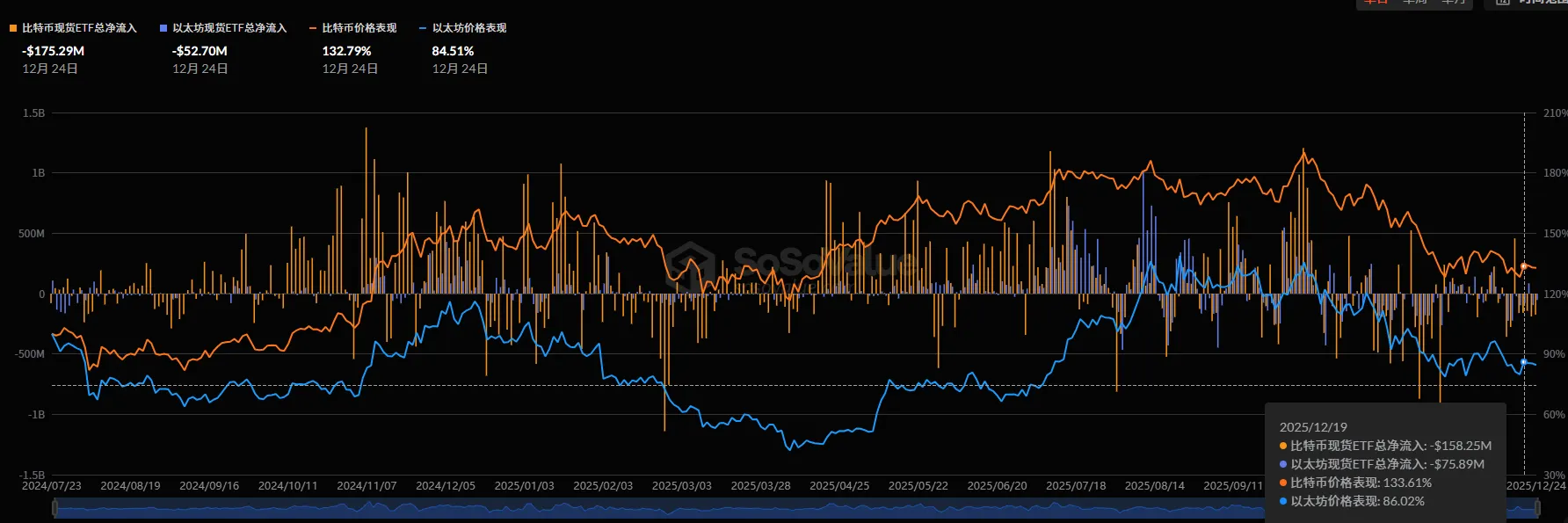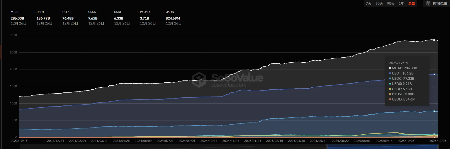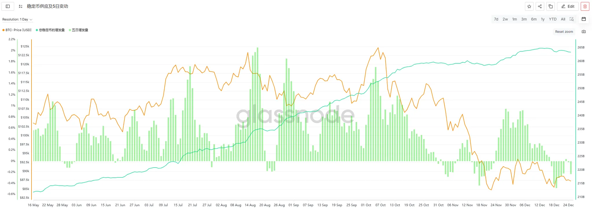 本周(12/20-12/26)稳定币单周增发量为 - 3.26 亿美元,资金延续流出态势,但流出规模显著收窄。相较于上周 - 8.24 亿美元的负增发,本周日均负增发从 - 1.177 亿美元回落至 - 0.465 亿美元,整体资金流量环比上升 60%。大盘本周以震荡为主,未出现持续性下跌,与稳定币流出减弱的趋势形成相互印证。