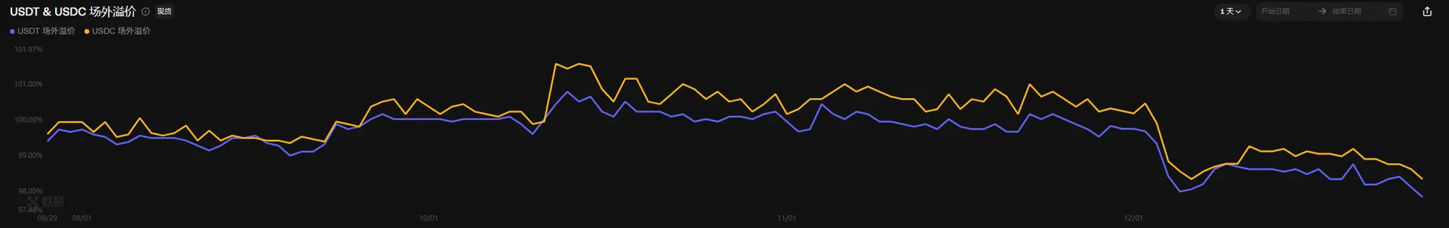 本周 USDT 与 USDC 的场外溢价率小幅回落,当前 USDT 折溢价为 97.86%,USDC 折溢价为 98.36%,均处于年内较低水平。这一现象反映出市场情绪依旧低迷,场外资金抄底意愿不足,同时存在一定的资金流出迹象。